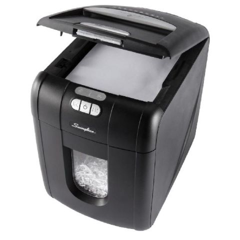 Experience the productivity of hands free shredding. The Swingline™ Stack-and-Shred™ shredder works without your supervision; just stack, shut and you're done. Stack up to 100 sheets for automatic shredding at home or in the office. Manual bypass handles 6 sheets of glossy, folded or crumpled paper.